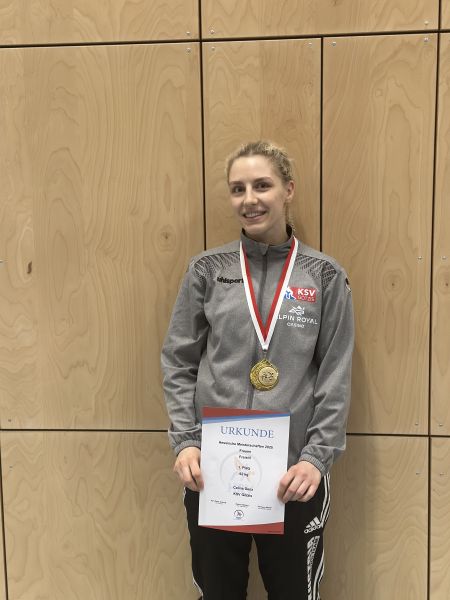 Zum Weltfrauentag am 08.03.25 fand die offene Hessische Landesmeisterschaft der Frauen, weiblichen Jugend und Schülerinnen in Haibach statt. Krankheits- und verletzungsbedingte Ausfälle von Emma Maitz, Anna Kathan, sowie Oleksandra Kogut und Veronika Markotenko ließen unser Team leider etwas schrumpfen. Trotzdem reisten mit Nika Ofenbeck, Ella Kathan, Sabrina Berchtold, Celina Denz und Lena Salzgeber fünf Sportlerinnen des KSV unter der Betreuung von Frauentrainer Markus Nagel nach Deutschland. Zusätzliche Unterstützung erhielt das Team von Phridon Shavadze und Andreas Berchtold.