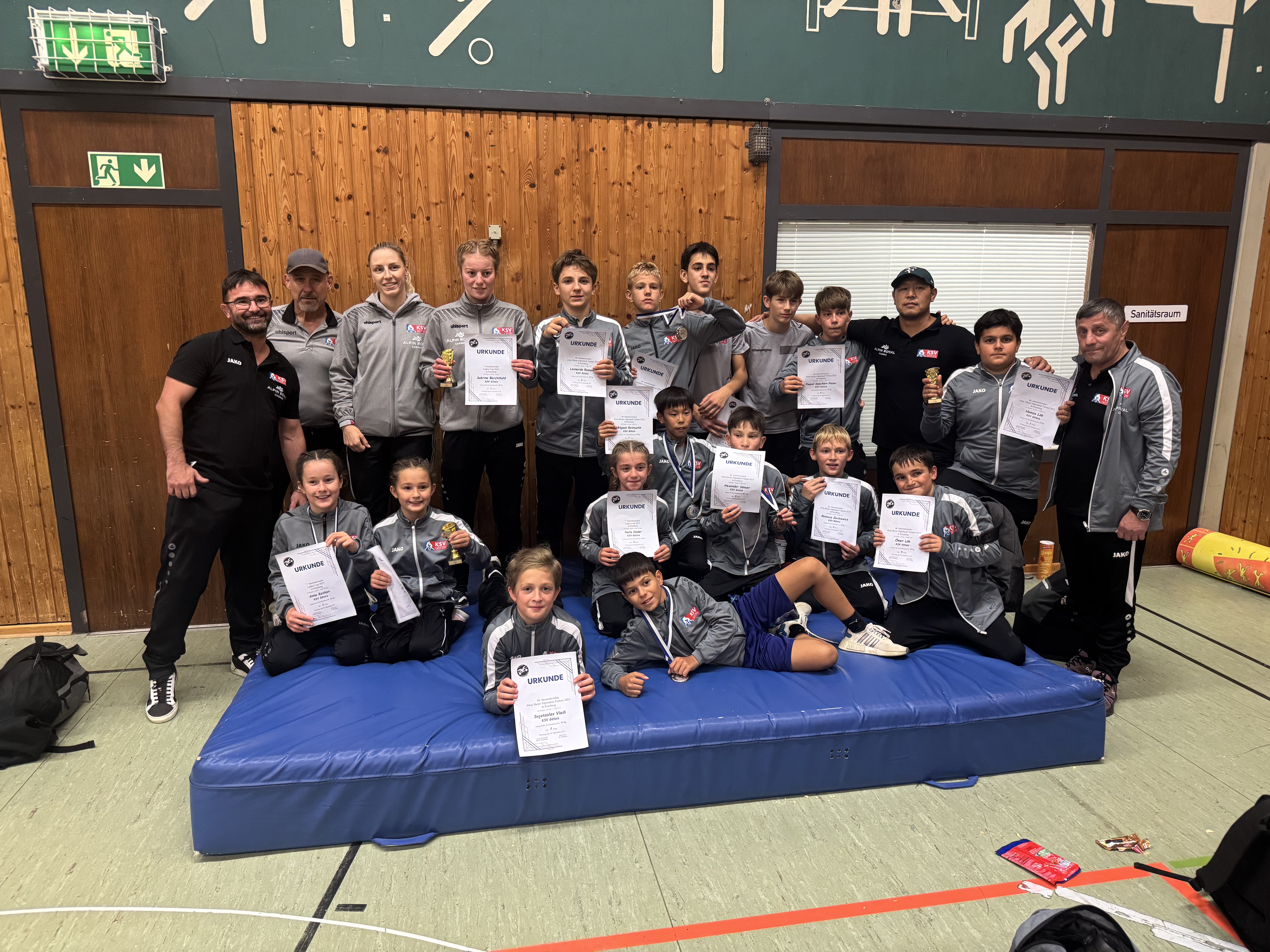 12 Jungs und 4 Mädchen traten in 15 Gewichtsklassen an und konnten insgesamt 9 Medaillen erringen – darunter 3 Goldmedaillen. Ella Kathan, Sabrina Berchtold und Hamza Lök gingen jeweils als Turniersieger von der Matte. Herzliche Gratulation!