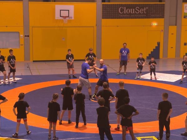 Gleich nach der Ankunft im baden-württembergischen Musberg – dem Heimatort von Frank Stäbler – wurden unsere Jungs mit T-Shirts und Turnbeutel ausgestattet. Um 11:00 Uhr startete dann die erste Trainingseinheit unter direkter Leitung der Weltklasseringer Frank Stäbler und Denis Kudla höchstpersönlich. Nach einem intensiven Aufwärmen ging es direkt ins Techniktraining, wobei beide Sportler eine ihrer jeweiligen Spezialtechniken vorführten und schrittweise erklärten. Während Frank Stäbler seinen gefürchteten Rumreißer demonstrierte, führte Denis Kudla eine Kombination aus Rumreißer und Durchschlüpfer vor. Doch auch die direkte Betreuung der Nachwuchsringer blieb Chefsache. Beim fleißigen Üben gaben beide Ringer ihre Tipps und Tricks an die Jugend weiter. Zum Abschluss der ersten Trainingseinheit konnte das Gelernte in einem Kampf angewendet werden.