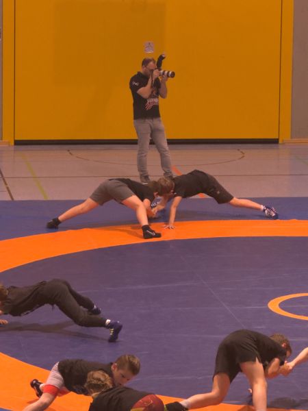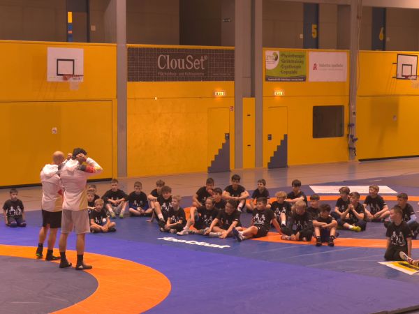 Gleich nach der Ankunft im baden-württembergischen Musberg – dem Heimatort von Frank Stäbler – wurden unsere Jungs mit T-Shirts und Turnbeutel ausgestattet. Um 11:00 Uhr startete dann die erste Trainingseinheit unter direkter Leitung der Weltklasseringer Frank Stäbler und Denis Kudla höchstpersönlich. Nach einem intensiven Aufwärmen ging es direkt ins Techniktraining, wobei beide Sportler eine ihrer jeweiligen Spezialtechniken vorführten und schrittweise erklärten. Während Frank Stäbler seinen gefürchteten Rumreißer demonstrierte, führte Denis Kudla eine Kombination aus Rumreißer und Durchschlüpfer vor. Doch auch die direkte Betreuung der Nachwuchsringer blieb Chefsache. Beim fleißigen Üben gaben beide Ringer ihre Tipps und Tricks an die Jugend weiter. Zum Abschluss der ersten Trainingseinheit konnte das Gelernte in einem Kampf angewendet werden.